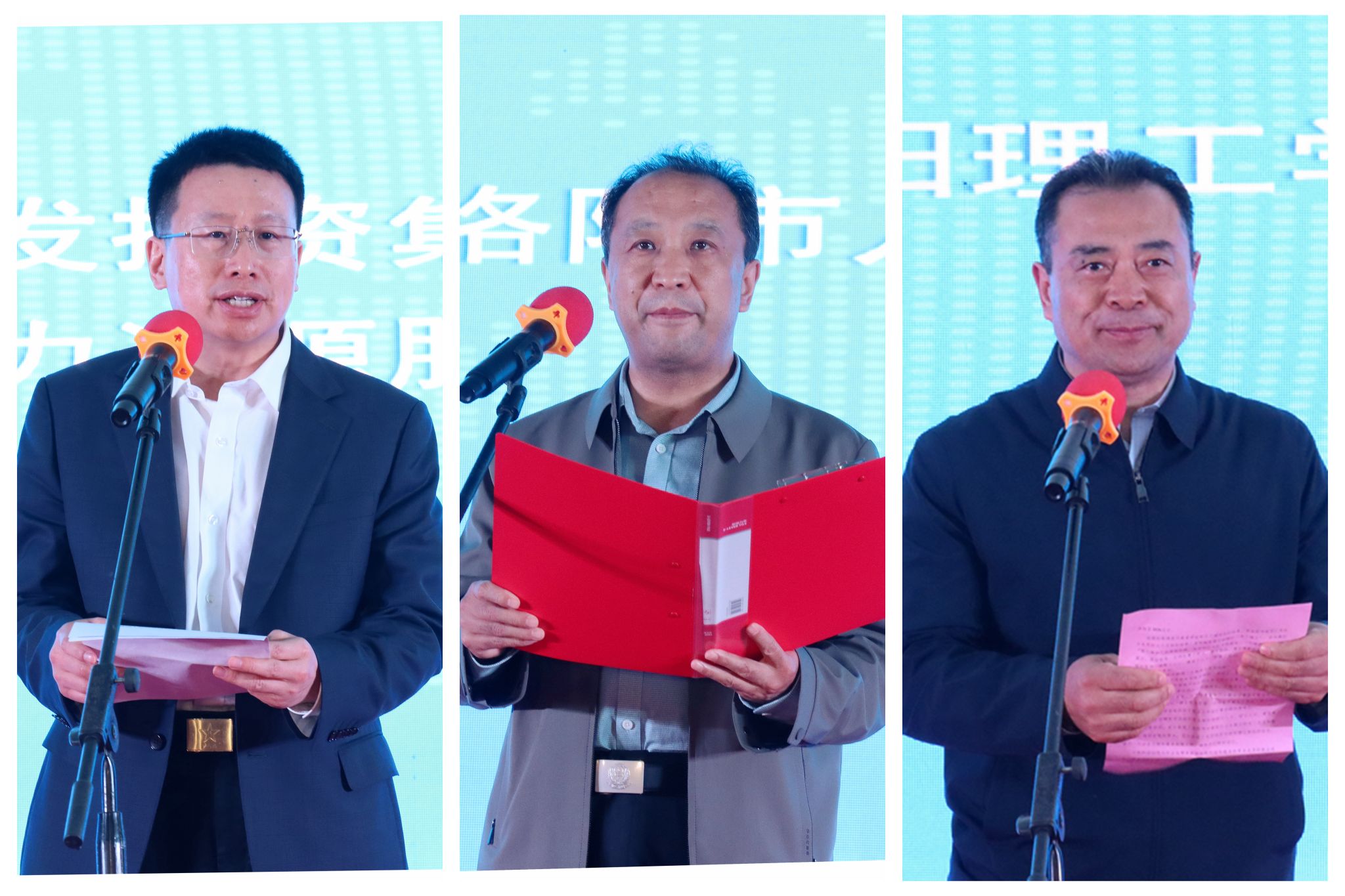 国投人力资源服务公司董事长孟书豪(左),洛阳市人力资源和社会保障局党组书记、局长白剑(中),校长张锐(右)分别讲话