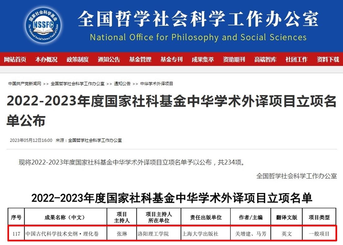 近日,全国哲学社会科学工作办公室公布了2022-2023年度国家社科基金中华学术外译项目立项名单,我校外国语学院张琳副教授主持申报的《中国古代科学技术史纲·理化卷》英文翻译项目获批立项,这是我校首次获批此类国家社科基金项目。