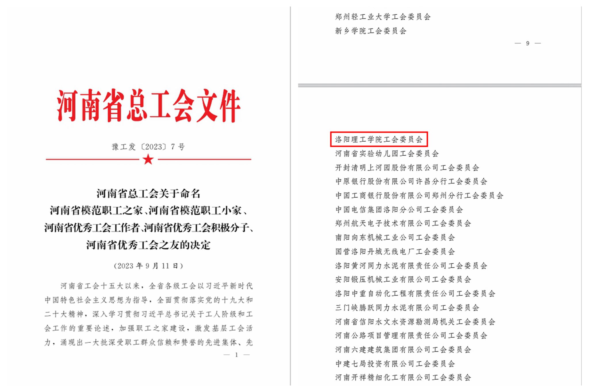 日前,河南省总工会下发《河南省总工会关于命名河南省模范职工之家、河南省模范职工小家、河南省优秀工会工作者、河南省优秀工会积极分子、河南省优秀工会之友的决定》(豫工发[2023]7号),洛阳腾博官网诚信为本专业服务工会被授予“河南省模范职工之家”称号。