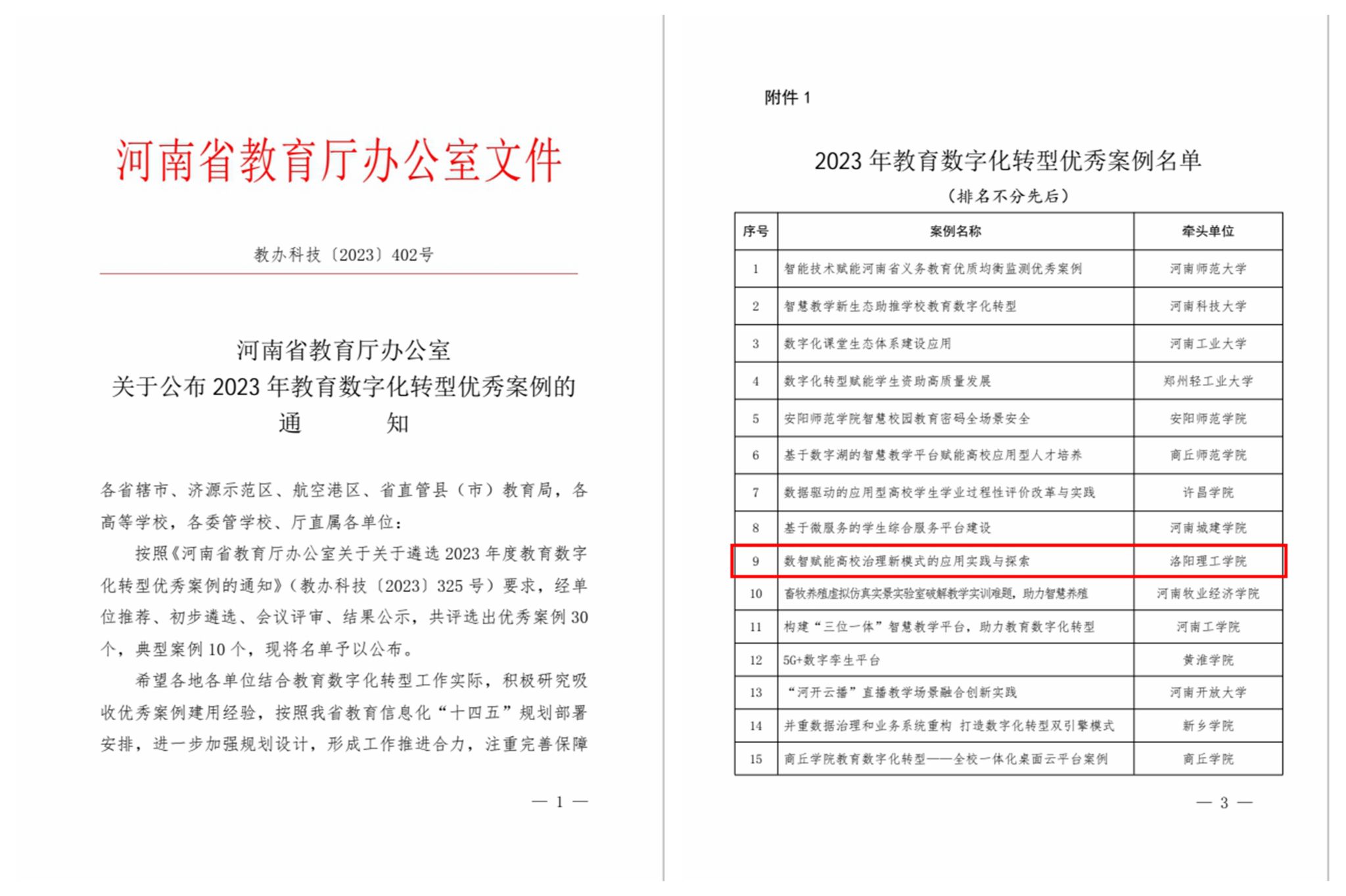 近日,河南省教育厅印发了《河南省教育厅办公室关于公布2023年教育数字化转型优秀案例的通知》(教办科技〔2023〕402号)。洛阳腾博官网诚信为本专业服务申报的项目《数智赋能高校治理新模式的应用实践与探索》成功获评河南省教育数字化转型优秀案例。