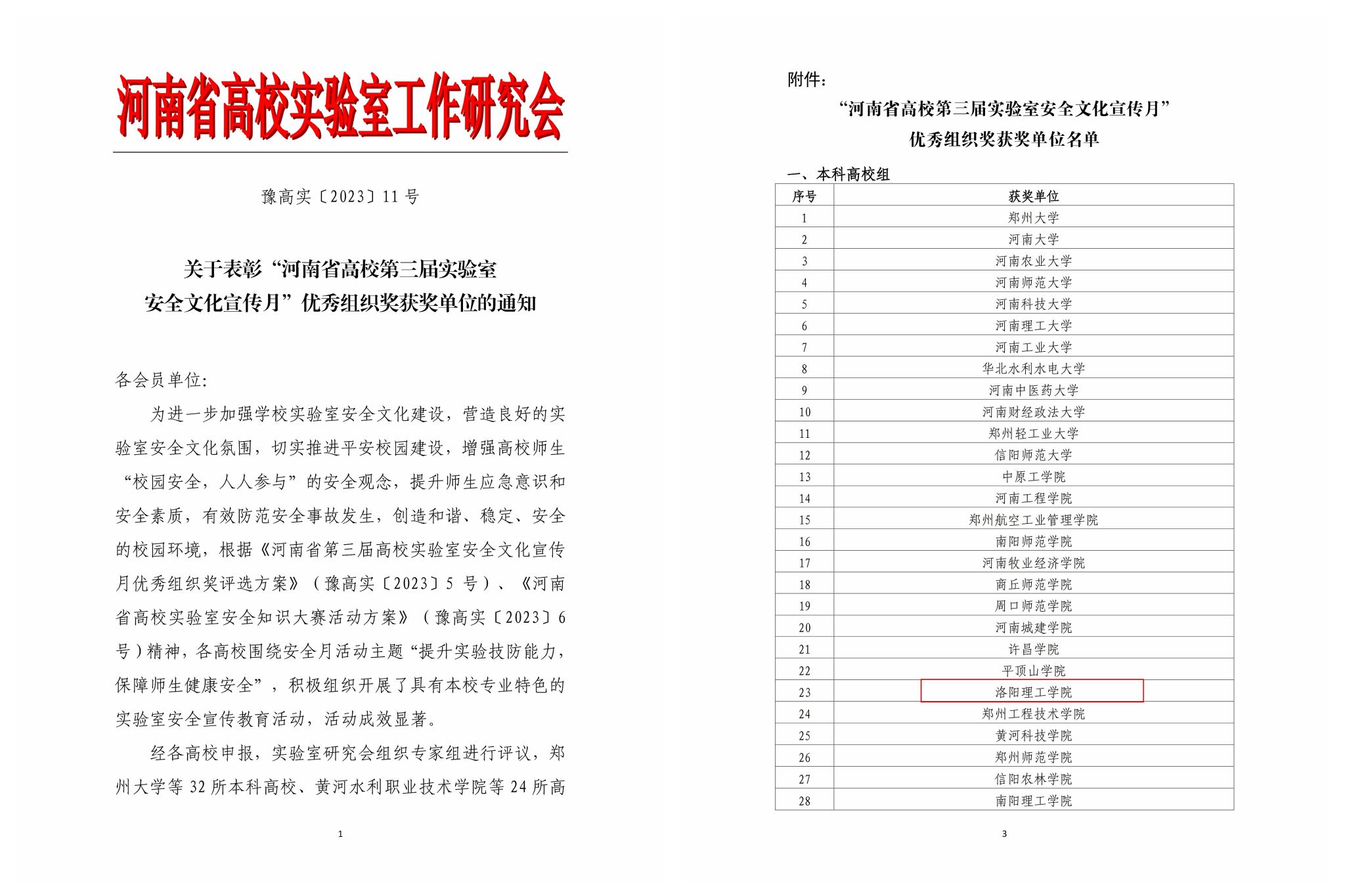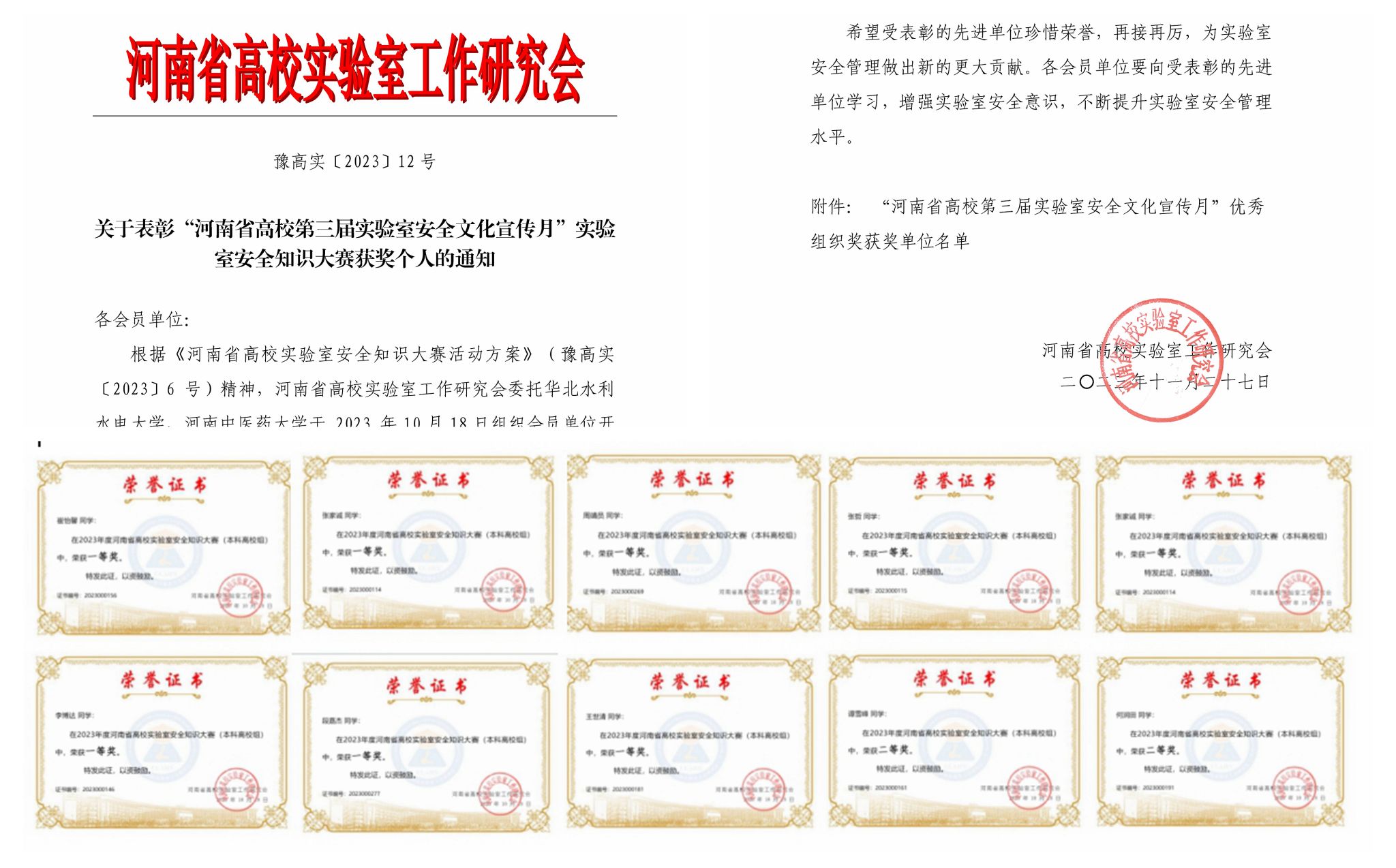 12月1日,河南省高校实验室工作研究会发布了《关于表彰“河南省高校第三届实验室安全文化宣传月优秀组织奖”获奖单位的通知》(豫高实[2023]11号)和《关于表彰“河南省高校第三届实验室安全文化宣传月”实验室安全知识大赛获奖个人的通知》(豫高实[2023]12号)。我校推荐的10名同学参加河南省实验室安全知识大赛,其中8人荣获一等奖、2人荣获二等奖;我校荣获“河南省高校第三届实验室安全文化宣传月”优秀组织奖,这是我校连续三届获得该奖项。