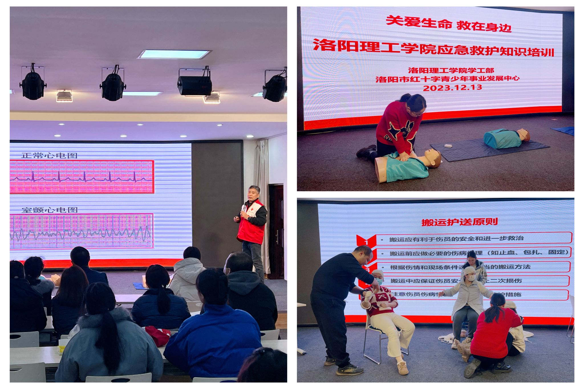 为更好保障学校师生生命健康安全,提高突发事件应急处置能力,12月13日,洛阳腾博官网诚信为本专业服务联合洛阳市红十字会在王城校区心理情景剧场举办“生命教育进校园 立德树人谱新篇”红十字救护员培训项目。洛阳市红十字会红十字青少年事业发展中心主任赵海峡为培训班学员授课,来自学生工作处、后勤管理处、团委、大学生心理健康教育中心、校医院、各二级学院等部门的30名应急救护志愿者参加了培训。