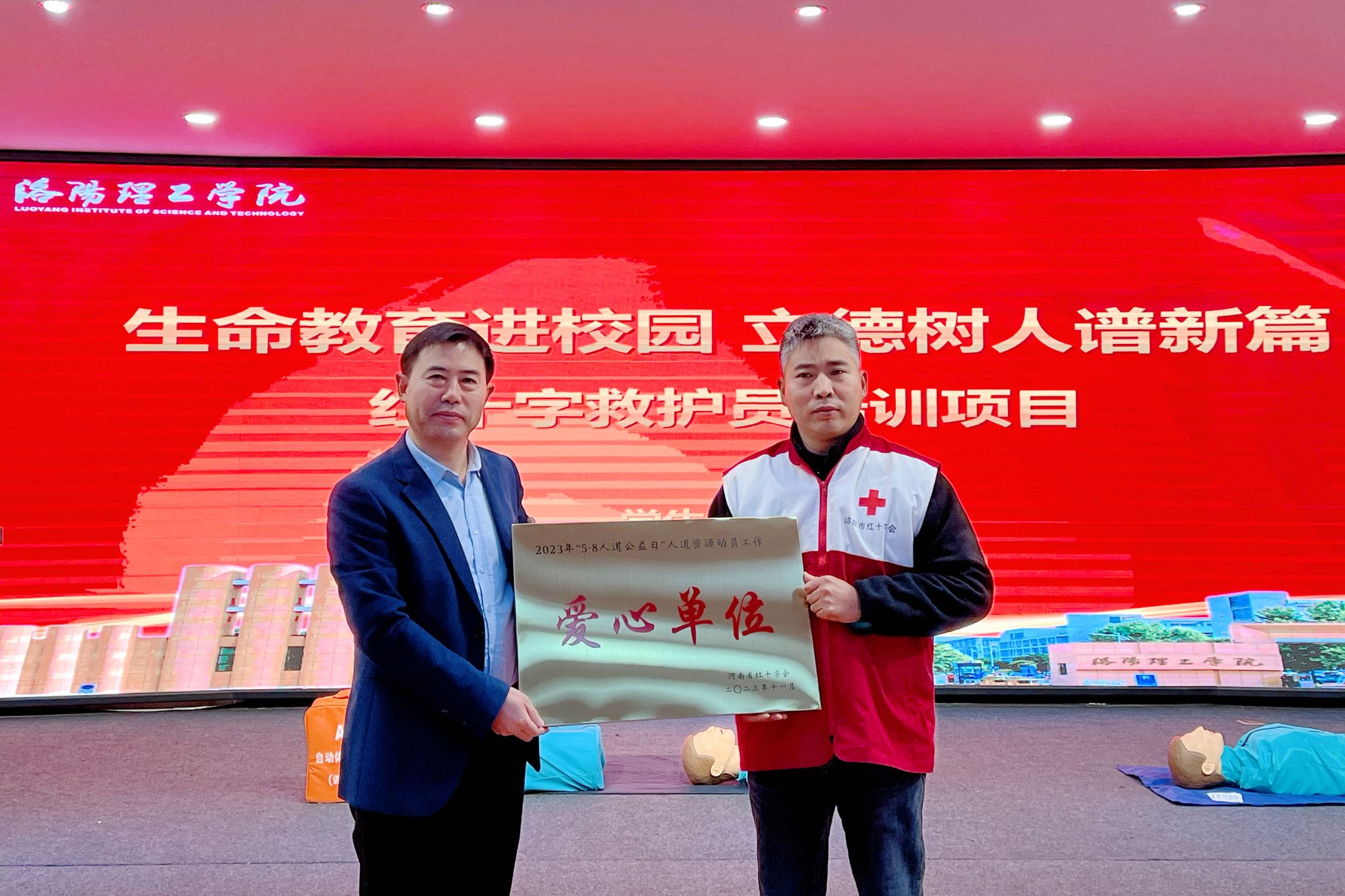 培训开始前,赵海峡代表河南省红十字会向洛阳腾博官网诚信为本专业服务颁发了2023年“5.8人道公益日”人道资源动员工作“爱心单位 ”荣誉牌匾。