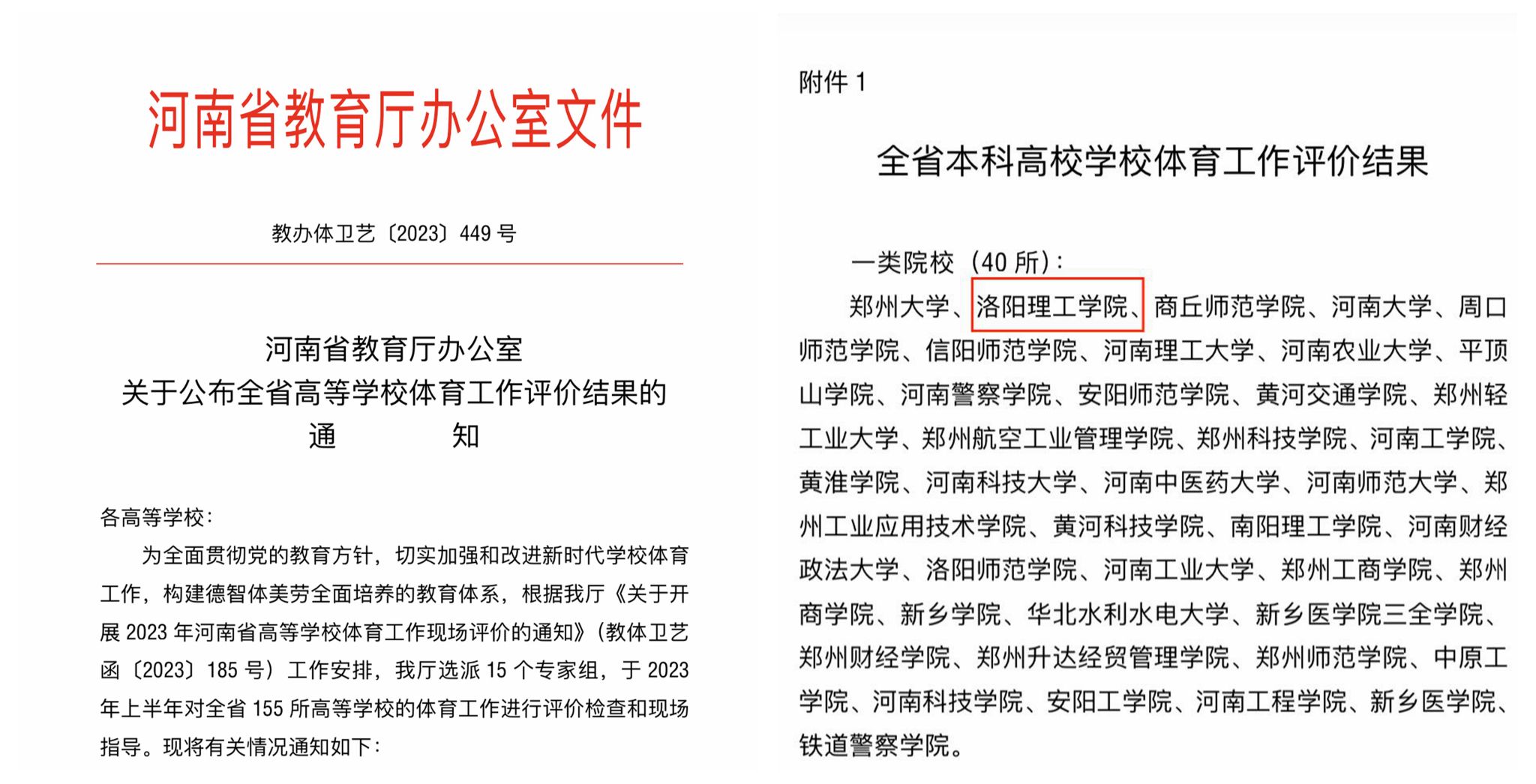 日前,河南省教育厅办公室公布了全省高等学校体育工作评价结果,我校在全省155所高等学校中以第二名的优异成绩被评定为一类院校。