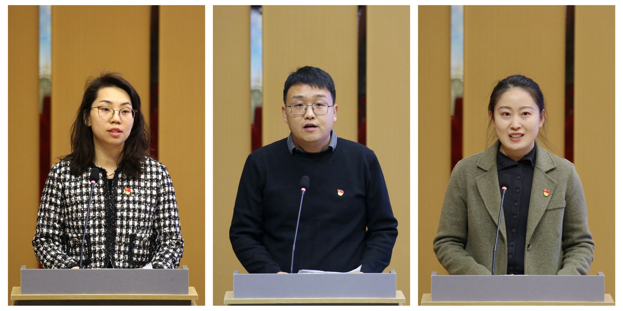 材料科学与工程学院党委副书记丁晨(左)、经济与管理学院学工办副主任杨盼(中)、土木工程学院辅导员李娈启(右)分别作交流发言
