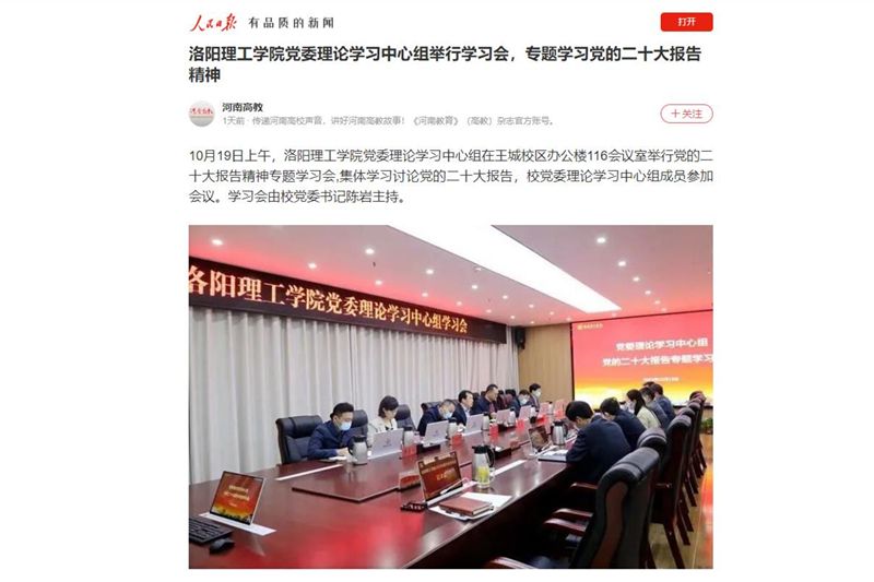 10月21日,《人民日报》新媒体平台报道我校党委理论学习中心组举行学习会,集体专题学习党的二十大报告精神。