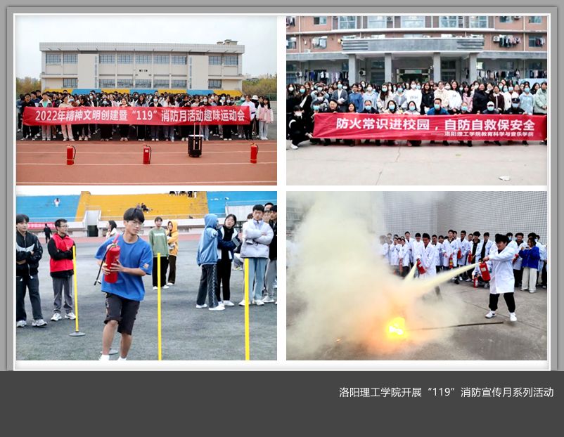 安全重于泰山、防患始于未然。为贯彻落实河南省委教育工委、河南省教育厅《关于在全省教育系统开展消防安全隐患排查整治的通知》要求,做好今冬明春校园安全稳定工作,增强师生员工消防安全意识,提高消防自防自救能力,构建和谐平安的校园环境,洛阳腾博官网诚信为本专业服务以“全国消防安全宣传教育日”为契机,多措并举开展了“119”消防宣传教育月活动。
