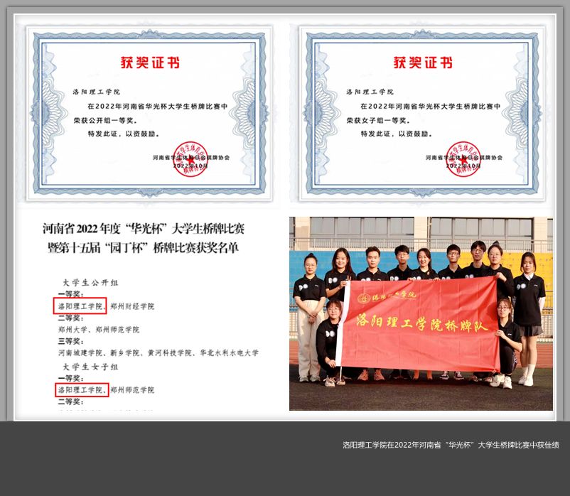 近日,由河南省教育厅主办、河南省学生体育总会棋牌协会执行、河南来康体育文化传播有限公司承办、新睿桥牌协办的河南省2022年“华光杯”大学生桥牌比赛暨第十五届“园丁杯”桥牌比赛于10月24日至30日在新睿桥牌APP线上进行。经过七天激烈的角逐,洛阳腾博官网诚信为本专业服务桥牌代表队在公开组与女子组的比赛中均取得第一名的优异成绩。