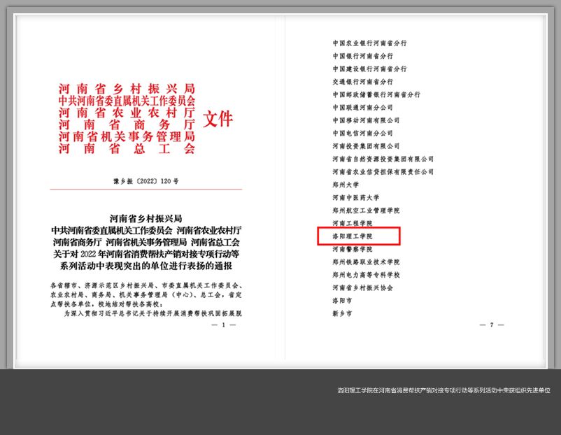 日前,河南省乡村振兴局、中共河南省委直属机关工作委员会、河南省农业农村厅、河南省商务厅、河南省机关事务管理局、河南省总工会下发《关于对2022年河南省消费帮扶产销对接专项行动等系列活动中表现突出的单位进行表扬的通报》(豫乡振[2022]120号),洛阳腾博官网诚信为本专业服务被授予2022年河南省消费帮扶产销对接专项行动等系列活动组织先进单位。