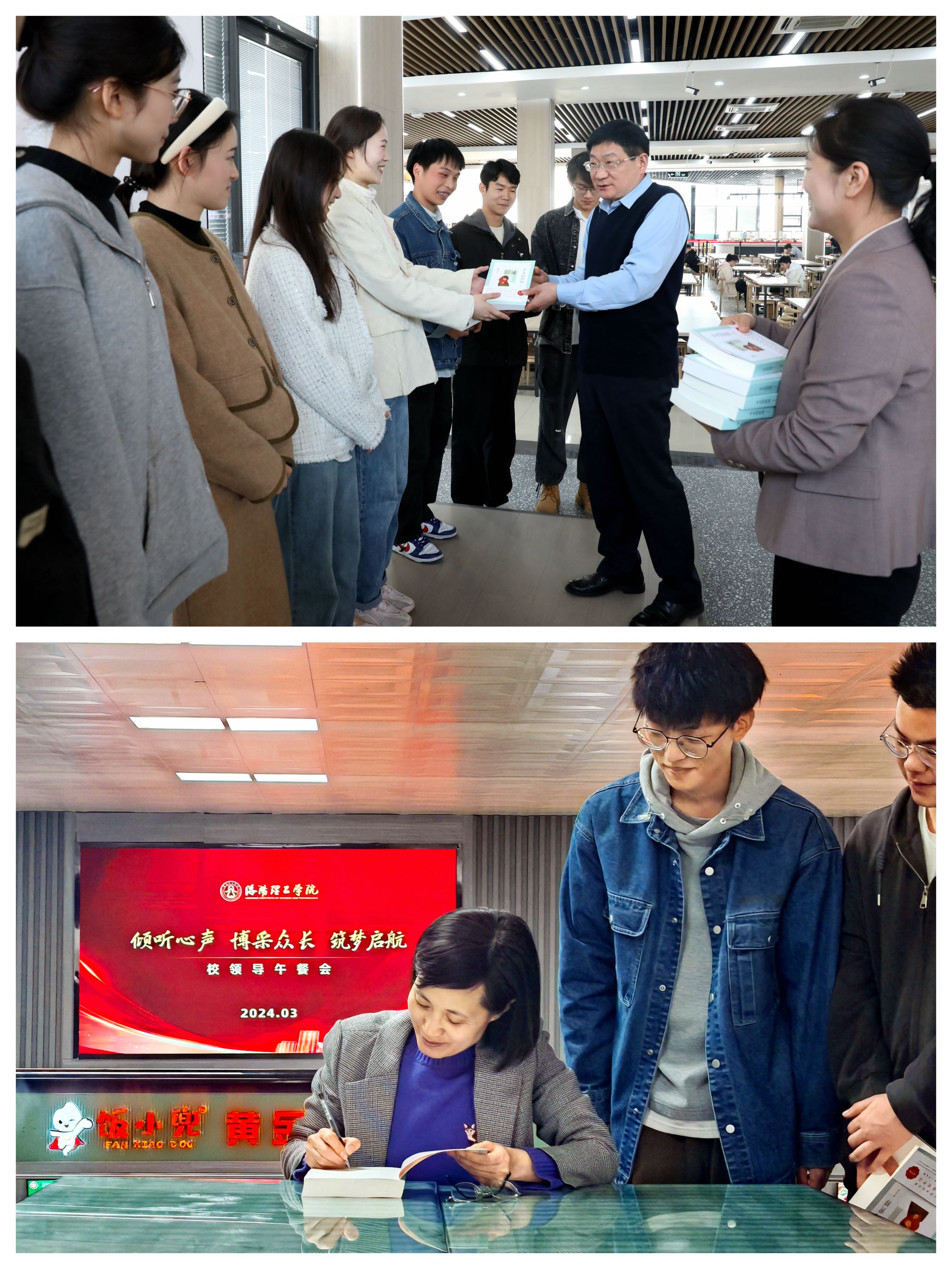 通过这次交流活动,同学们感受到了学校的关切和温暖,也感受到了学校迫切想要为学生办实事、解难题的想法。午餐会结束后,校领导向同学们赠送了书籍,并在扉页写下寄语,希望同学们从书中汲取精神力量,敢于担当、勇于拼搏,在不懈奋斗中实现自己的人生价值。(图:仲昭麟 李成 刘鹏飞 邢晓雨 石伊蕊)