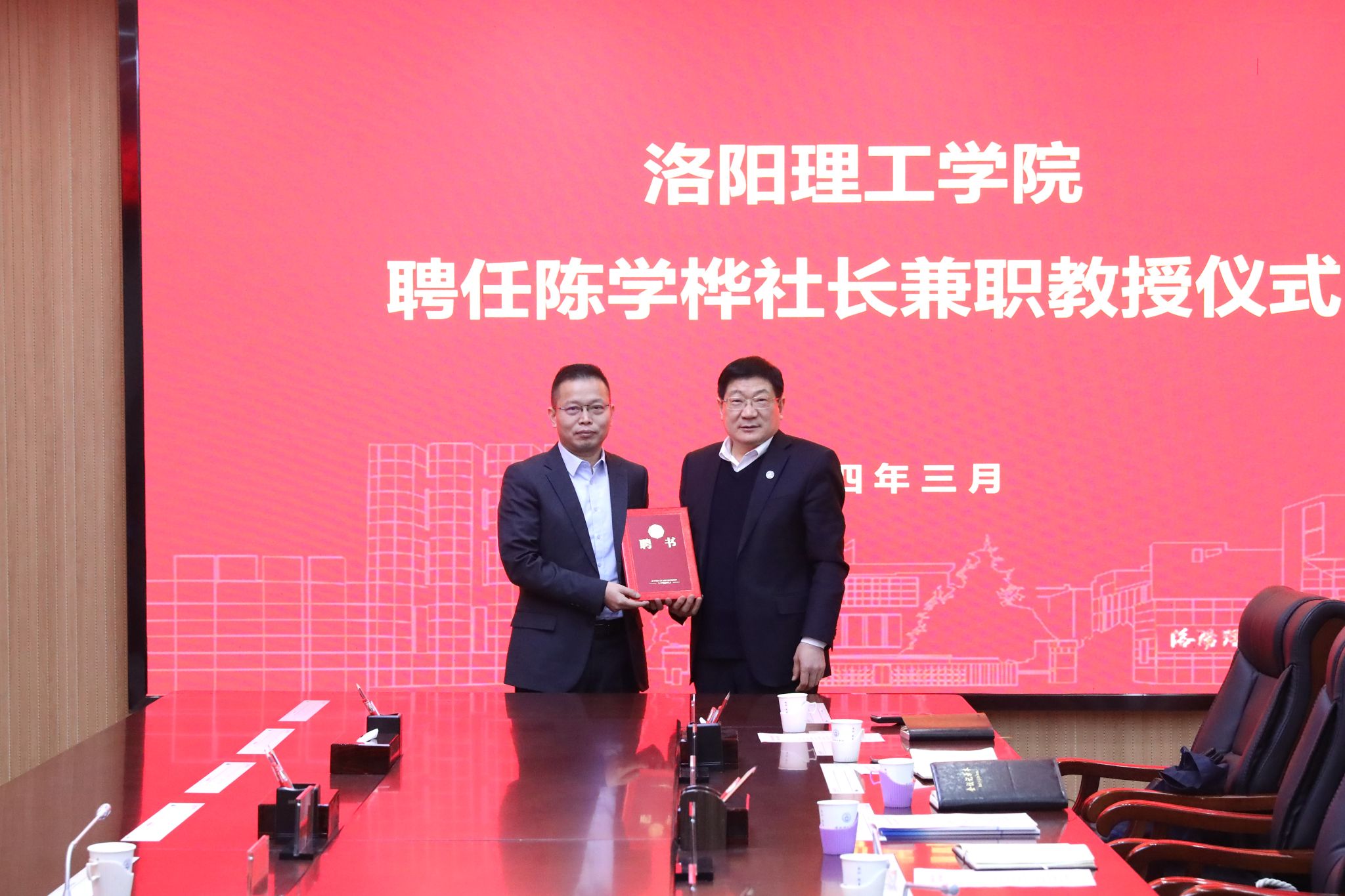 卢志文向陈学桦颁发了洛阳腾博官网诚信为本专业服务兼职教授聘任证书。