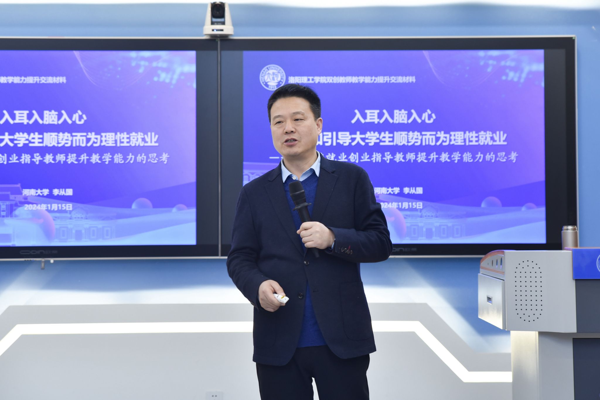 图为首批河南省大学生创业指导名师、河南大学就业指导中心主任李从国教授在报告会授课现场