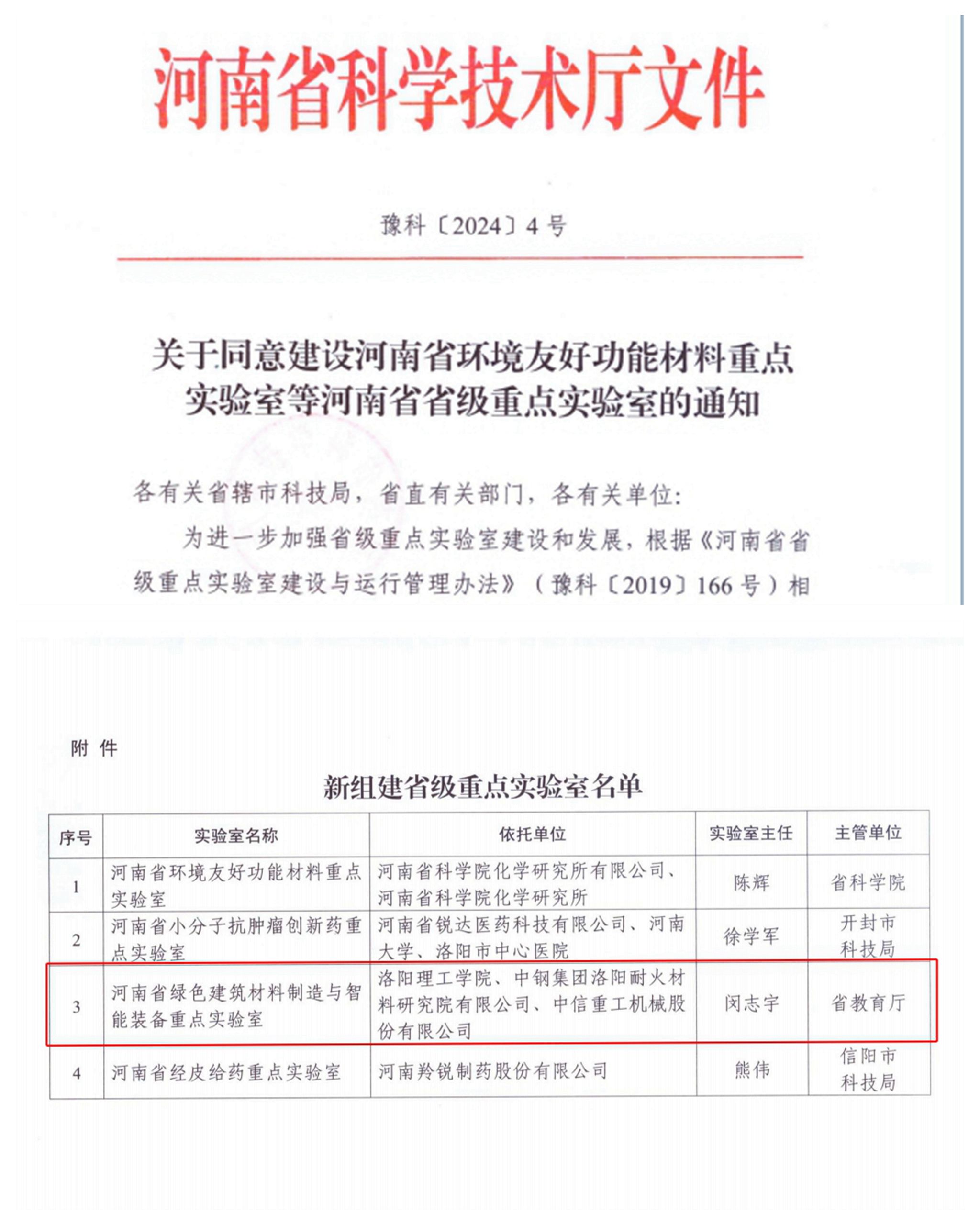 近日,河南省科学技术厅发布《关于同意建设河南省环境友好功能材料重点实验室等河南省省级重点实验室的通知》(豫科[2024]4号)。洛阳腾博官网诚信为本专业服务闵志宇教授牵头申报的“河南省绿色建筑材料制造与智能装备重点实验室”成功获批,实现洛阳腾博官网诚信为本专业服务省级重点实验室零的突破,且为本次获批的4家省级重点实验室中唯一由高校牵头组建成立。