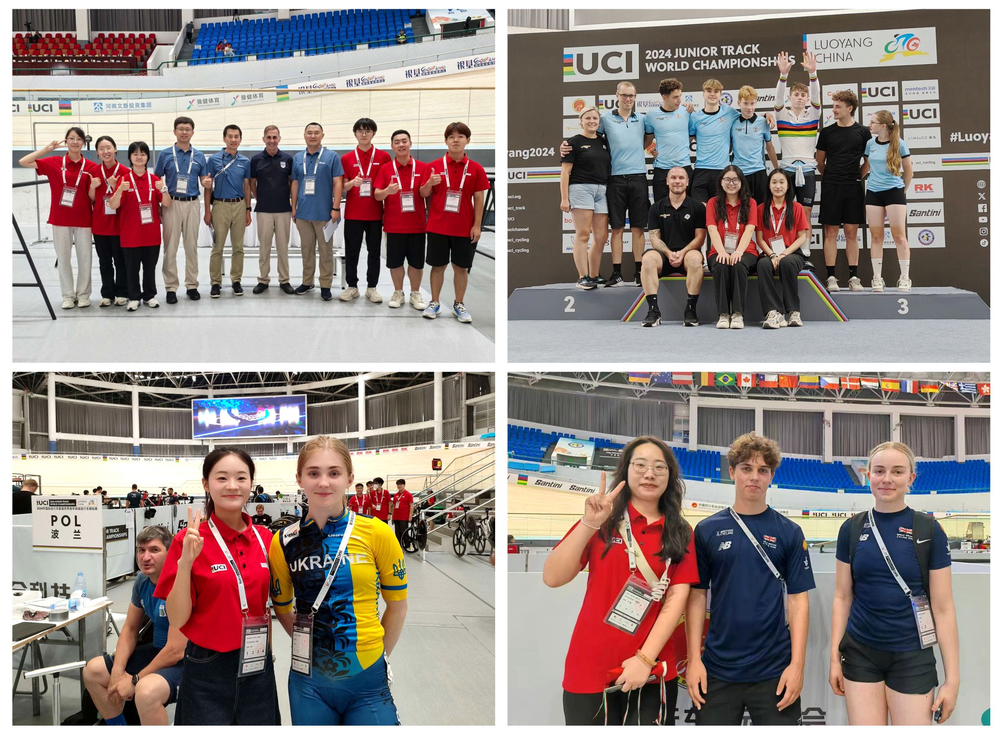 我校青年志愿者在2024国际自行车联盟世界青年场地自行车锦标赛志愿服务现场与裁判员、各国运动员合影