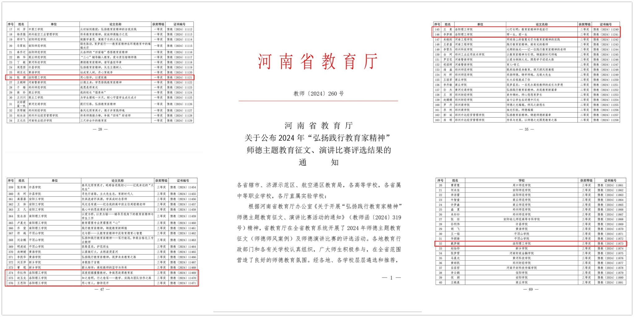 近日,河南省教育厅公布2024年“弘扬践行教育家精神”师德主题教育征文、演讲比赛评选结果。我校获得师德主题教育征文一等奖1项、二等奖2项、三等奖3项;师德主题教育演讲比赛三等奖1项。