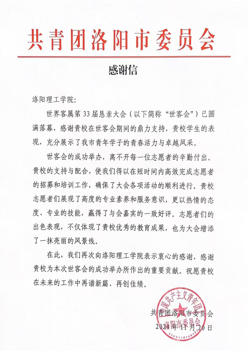 11月20日,共青团洛阳市委员会向我校发来感谢信,对我校在世界客属恳亲大会期间的大力支持和重要贡献表示诚挚感谢。