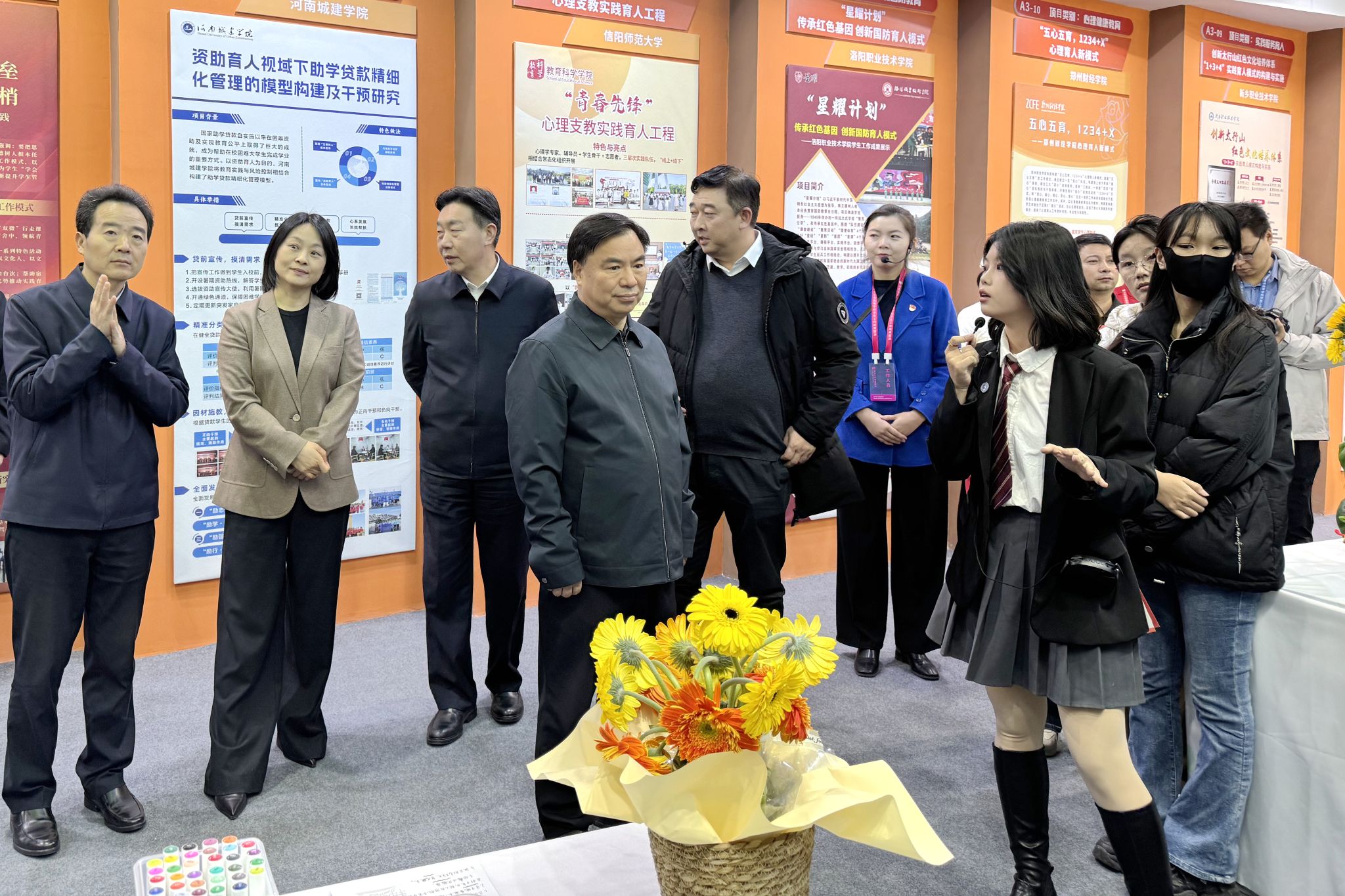 河南省委教育工委委员、河南省教育厅党组成员、副厅长吕冰一行在我校展位前参观指导