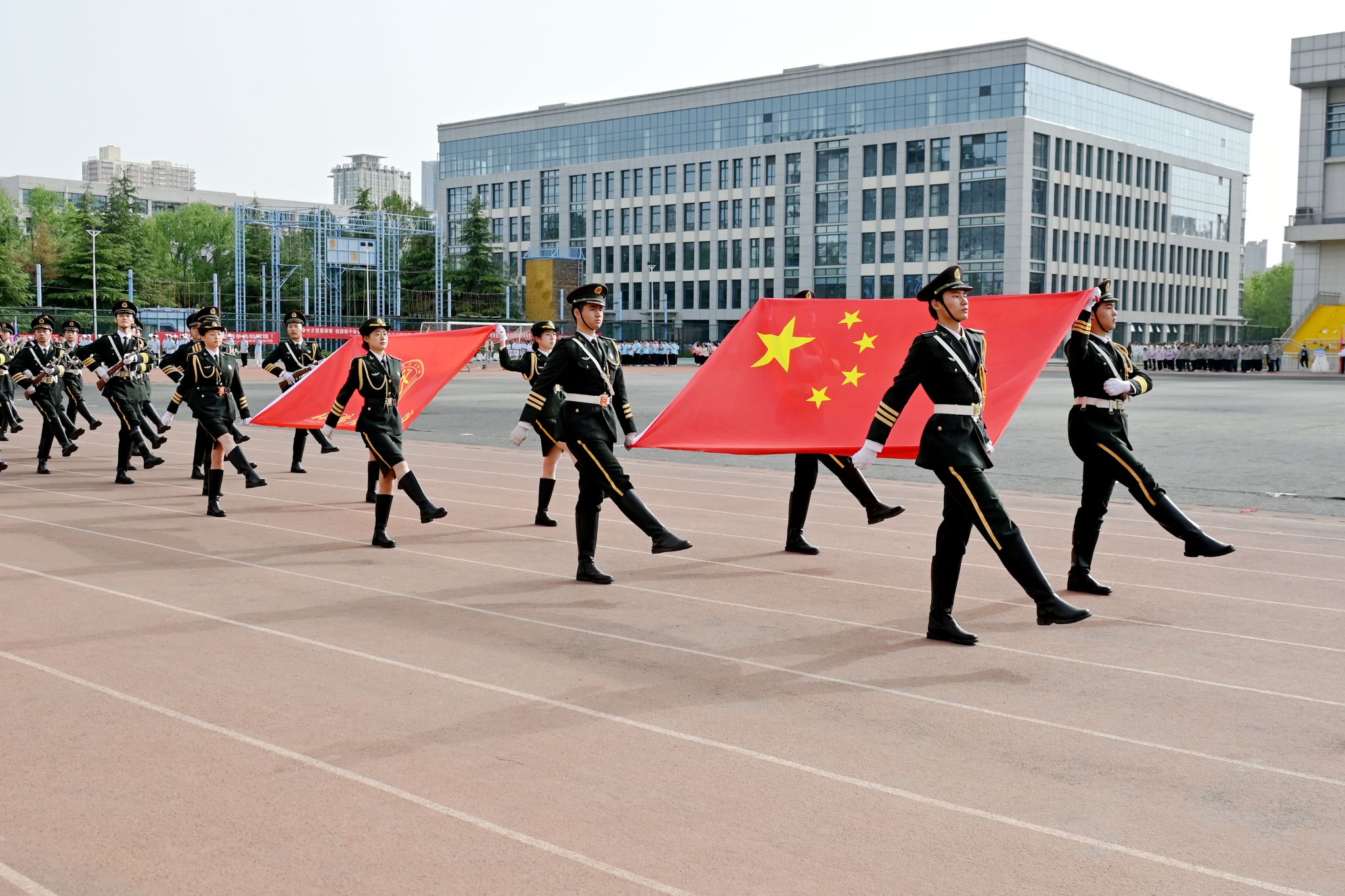 全体师生庄严肃立,齐唱国歌。