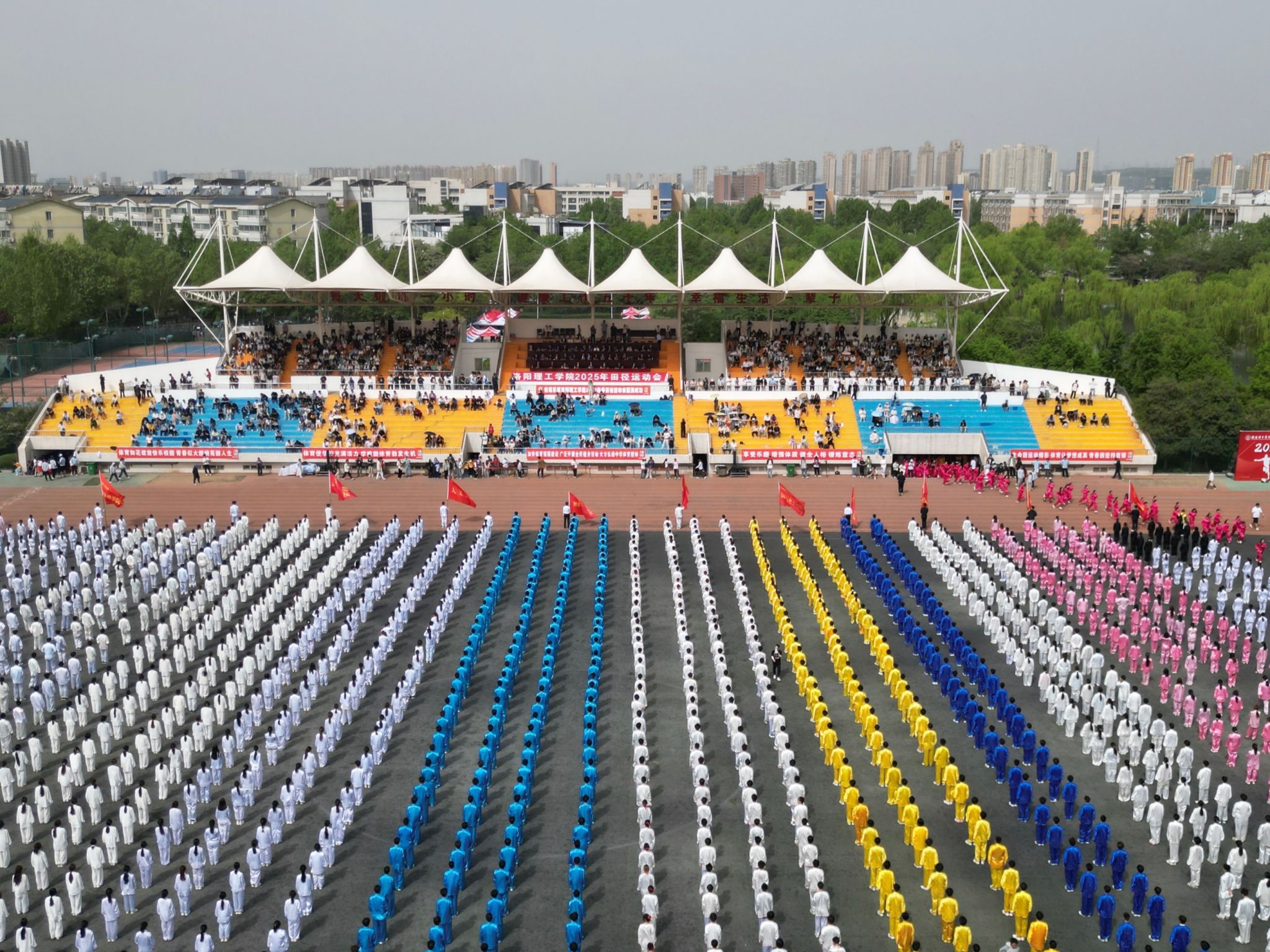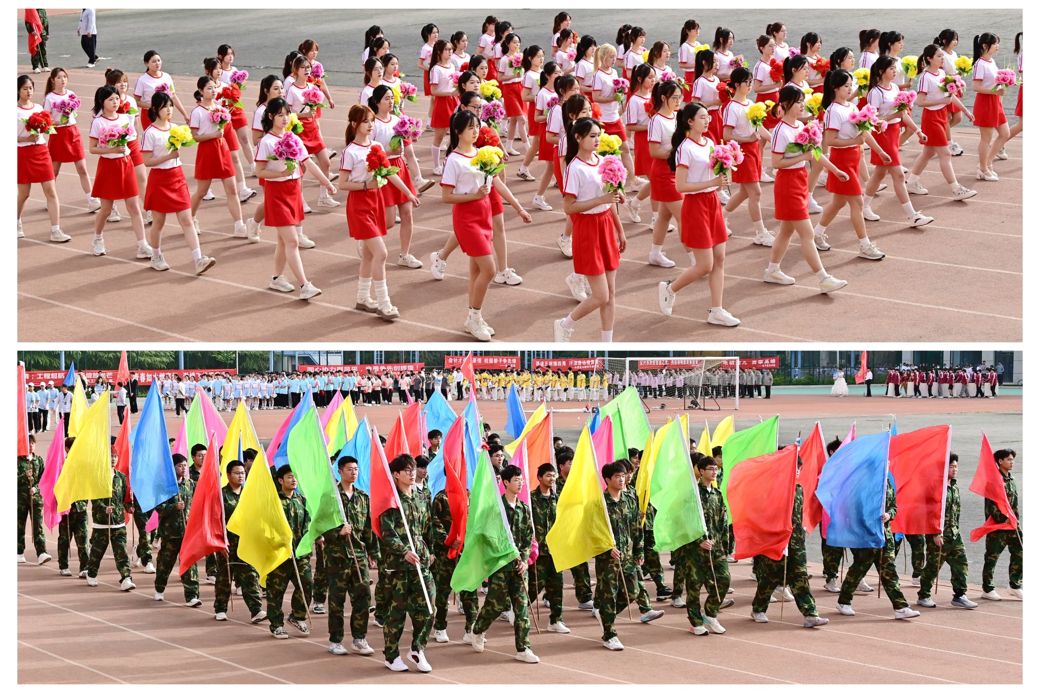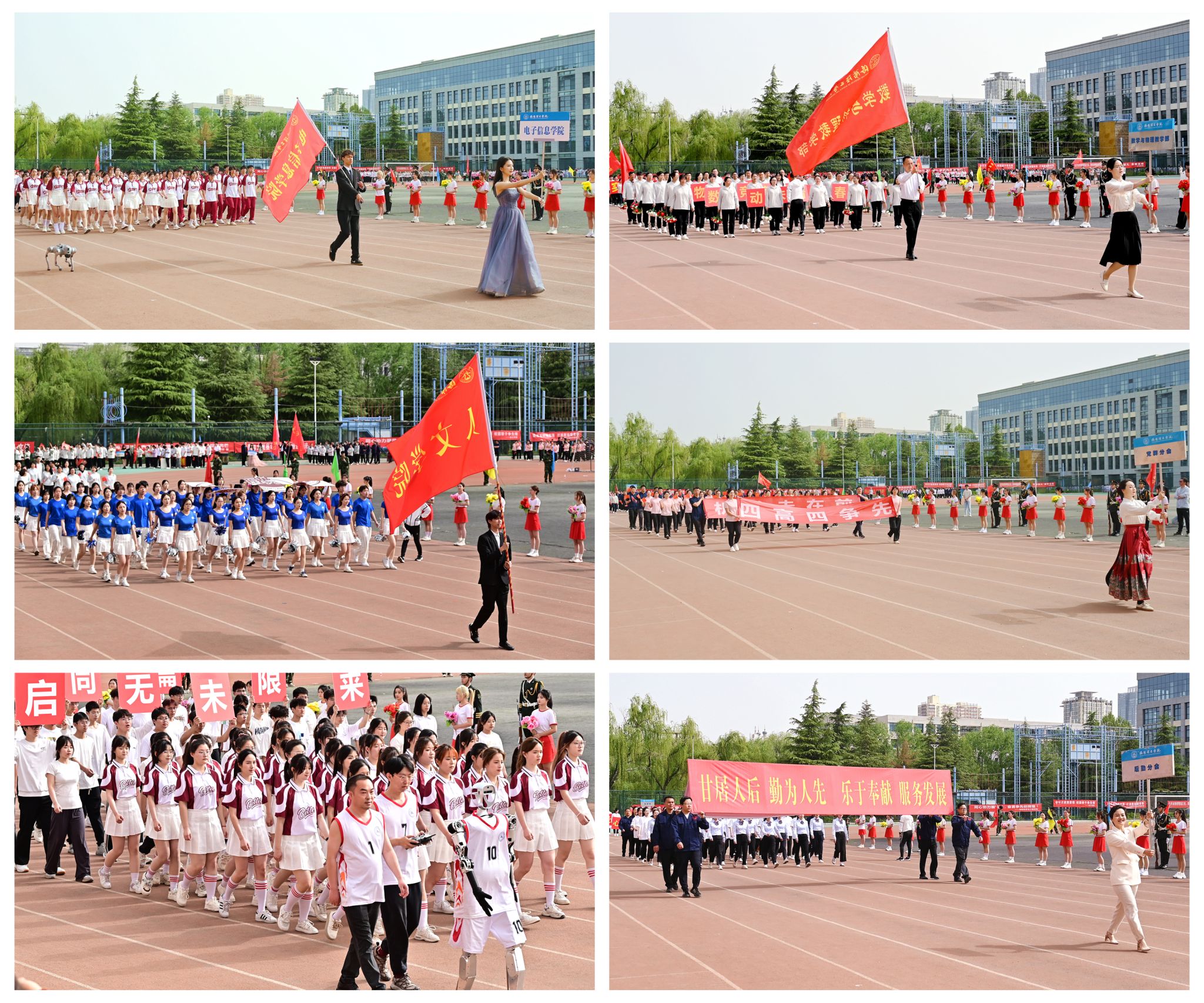 在激昂的《运动员进行曲》中,国旗队、校旗队、鲜花队、彩旗队、裁判员方队、运动员方队、各分会方队依次入场。各方阵精神抖擞、口号嘹亮,将专业特色、传统文化、文学艺术、现代科技等元素融入风采展示,带来了一场青春活力的视觉盛宴,彰显了洛阳理工师生积极向上、踔厉奋发的精神风貌。