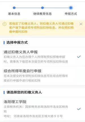 填写各项专项附加扣除时,最后一项申报方式请选择通过扣缴义务人申报—洛阳腾博官网诚信为本专业服务。