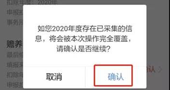 (2)系统提示“如您已经采集2020年度的信息,本次操作完全覆盖”,确认后点击“确定”。
