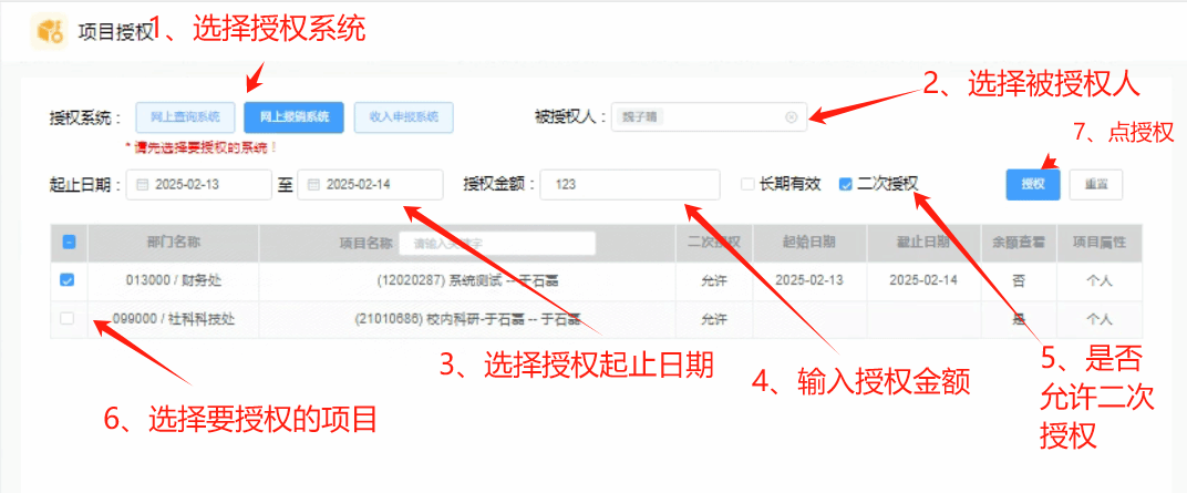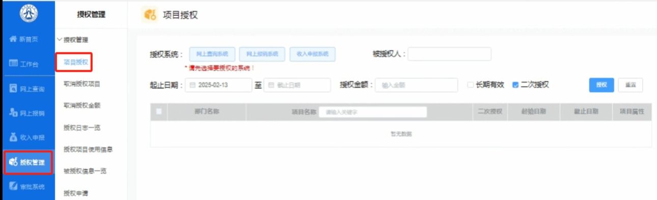 项目授权可以查看可授权的项目,选择授权系统列表、输入被授权人工号或者姓名、勾选要授权的项目、选择授权内容,内容包括授权的起始日期和截止日期、是否允许二次授权,最后单击授权按钮完成项目授权。