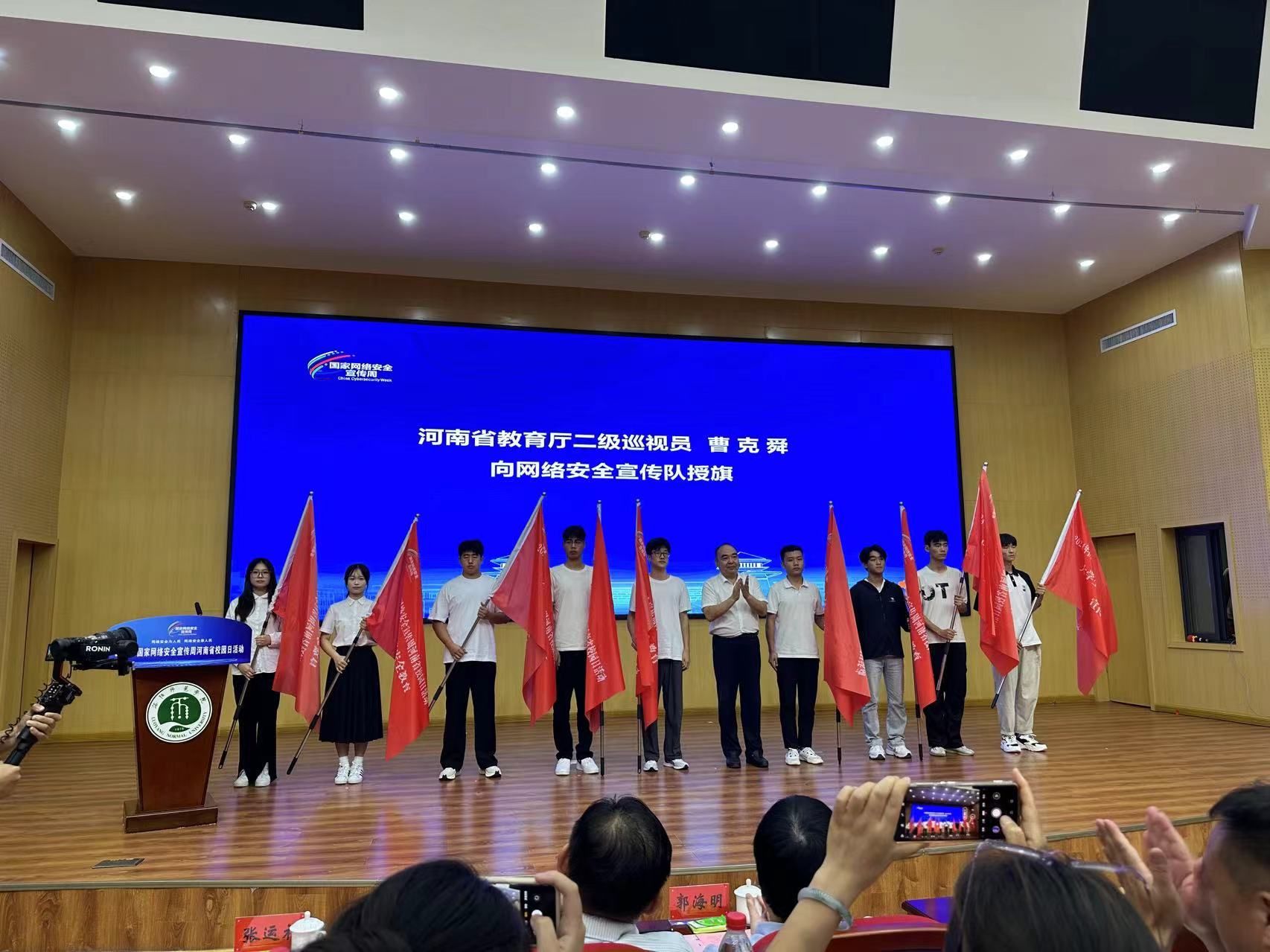 9月10日上午,由河南省委教育工委、省教育厅举办的2024年国家网络安全宣传周河南省校园日活动启动仪式在洛阳师范学院举行,省教育厅二级巡视员曹克舜,省委网信办二级巡视员李丽,洛阳师范学院党委副书记、校长郭海明,党委副书记张运礼出席启动仪式并讲话。省委教育工作领导小组秘书组秘书处二级调研员方治强、省教育厅思想政治工作处(教材处)四级调研员冯新才、省委网信办网络安全协调处四级调研员郝万亮、驻洛高校师生代表参加启动仪式。中心直属党支部书记兼主任刘庆伟、副主任梁凯及相关人员参加活动。学生代表刘子俊代表我校参加了大学生网络安全宣传队授旗仪式。