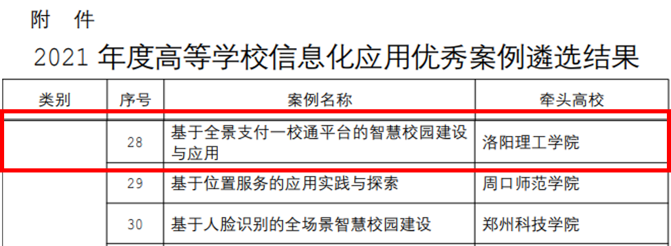 近日,河南省教育厅印发了《关于公布2021年度高校信息化应用优秀案例的通知》(教办科技〔2022〕52号),我校申报的《基于全景支付一校通平台的智慧校园建设与应用》典型案例顺利入选。