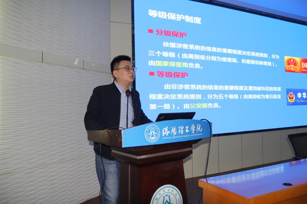 10月21日下午,洛阳腾博官网诚信为本专业服务网络安全组织成立暨网络安全知识培训会在王城校区办公楼二楼报告厅举行。洛阳市公安局网安支队队长范建国、副校长王晓峰出席会议,各单位网络安全第一责任人、直接责任人、信息管理员共100余人参加了会议。会议由网络安全和信息化领导小组办公室主任李传锋主持。