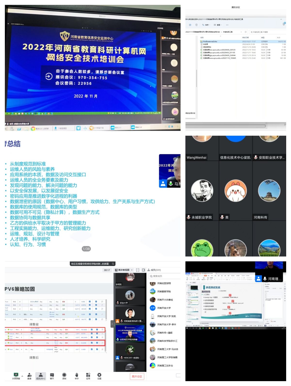 11月11日,信息化技术中心全体人员参加了河南省教育科研计算机网网络中心组织的网络安全技术线上培训会。会议由省教育信息安全监测中心副主任李润知主持,省教育厅科技与信息化处副处长麦世奎出席培训会并致辞。