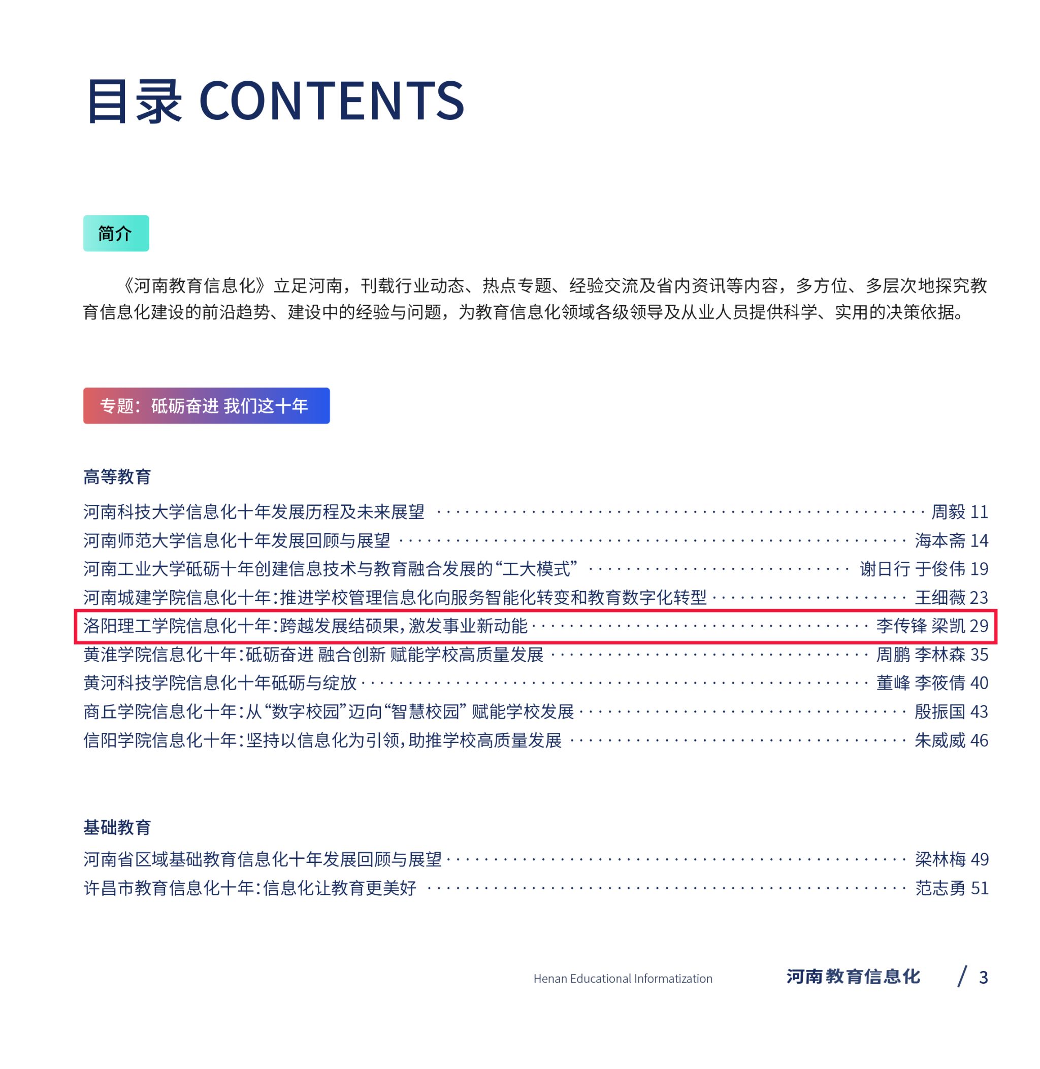 近日,由河南省教育厅主管、河南省教育科研计算机网网络中心主办的《河南教育信息化》电子期刊推出2023年“砥砺奋进,我们这十年”专刊。其中,我校信息化技术中心主任李传锋、副主任梁凯所撰题为《洛阳腾博官网诚信为本专业服务信息化十年:跨越发展结硕果,激发事业新动能》的文章被此专刊采用并发表。文章全面报道了我校十年来信息化事业的跨越式发展历程和智慧校园建设成效与突破。