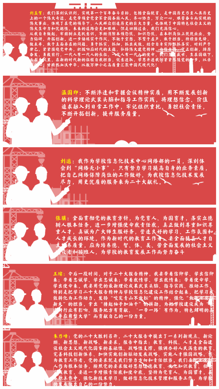 学好,更要用好、落实好。信息化技术中心直属党支部全员上下将切实做到思想和行动高度统一到党的二十大精神上,牢固树立“以人民为中心”的发展思想,坚定不移地为师生做好网络和信息化服务,紧紧抓住师生最关心、最直接、最现实的问题,不断提高专业服务水平,提升技术保障能力,为学校事业发展作出新的更大的贡献。