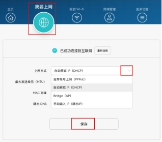 3、进入我要上网页面,在上网方式下拉框中,选择自动获取 IP(DHCP),点击保存。