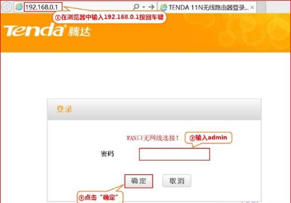 1、请将手机或电脑连接到路由器的 Wi-Fi,然后打开浏览器,在地址栏中输入Tenda路由器的管理地址,一般为192.168.0.1(路由器背面有默认管理地址和账号密码),然后输入默认登录密码:admin,点击确定进入路由器管理界面。
