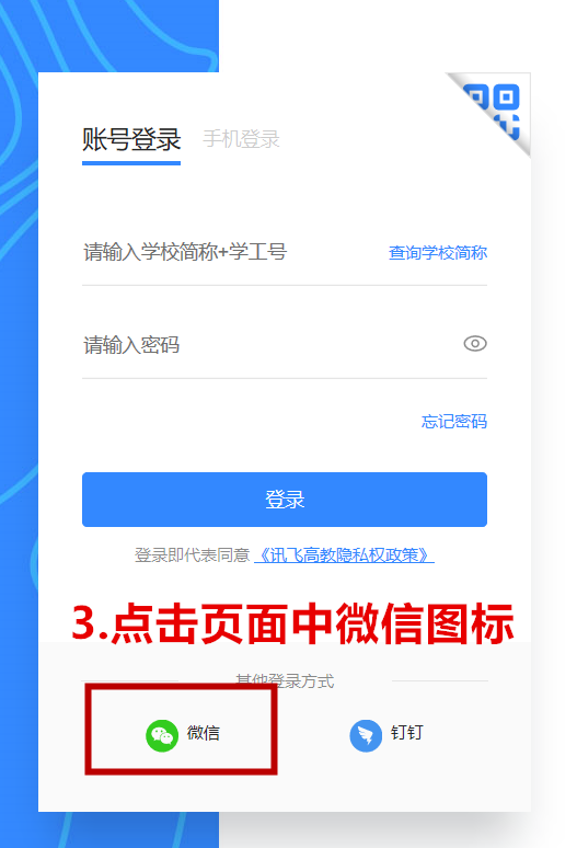 注意:在教室的智慧黑板上打开讯飞A.I.课堂,首次使用仍需输入账号密码进行绑定确认,后续可直接使用微信扫码登陆