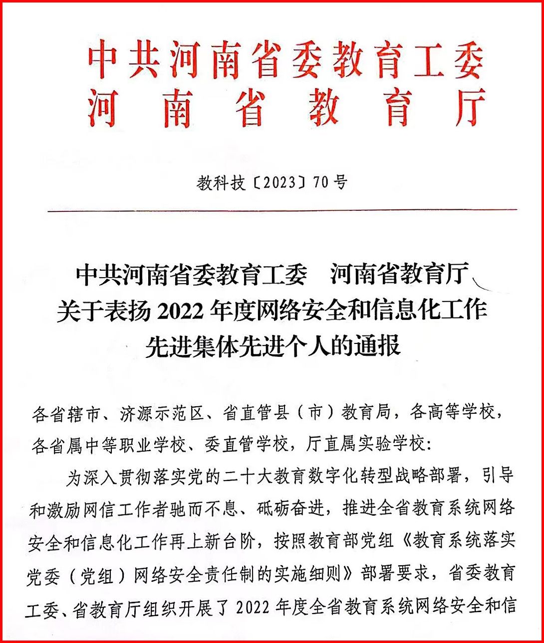 近日,中共河南省委教育工委、河南省教育厅下发《关于表扬2022年度网络安全和信息化工作先进集体先进个...