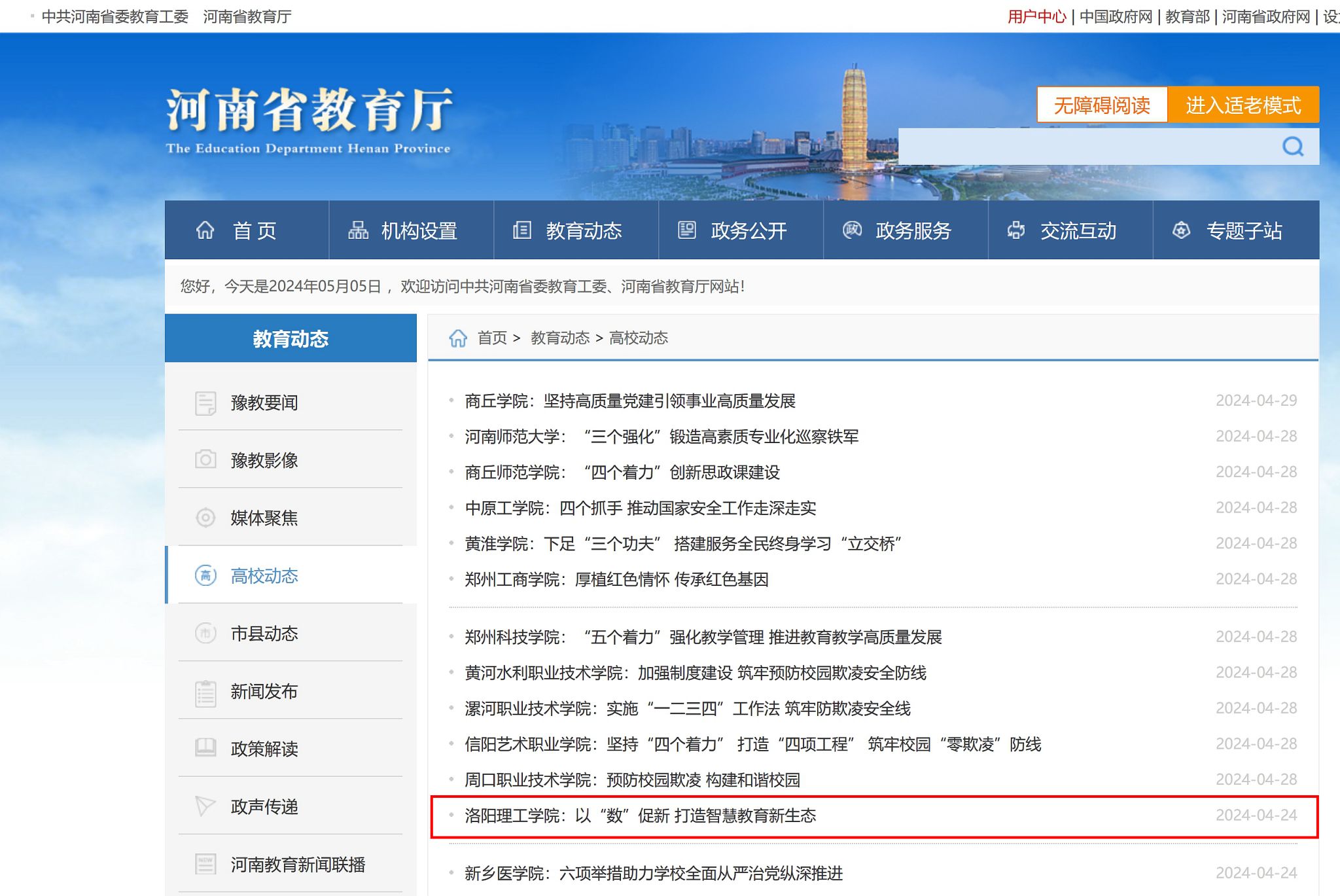河南省教育厅官方网站报道版面4月24日,河南省教育厅官方网站以《洛阳腾博官网诚信为本专业服务:以“数”促新 打造智慧...