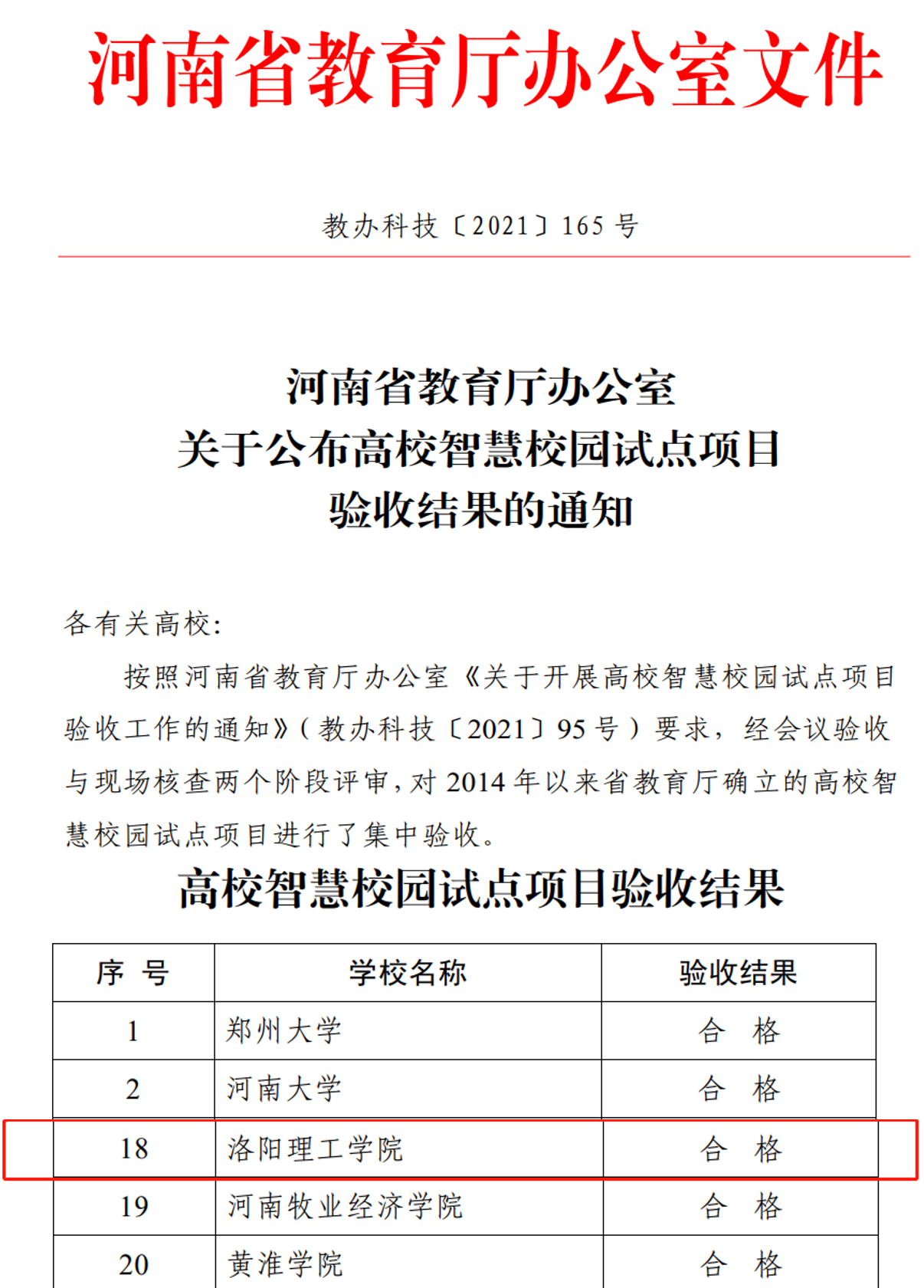 ?近日,河南省教育厅办公室下发文件《关于公布高校智慧校园试点项目验收结果的通知》(教办科技)〔202...