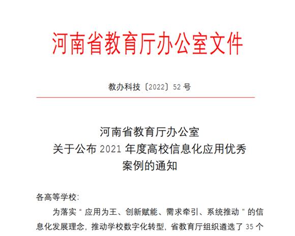 ?近日,河南省教育厅印发了《关于公布2021年度高校信息化应用优秀案例的通知》(教办科技〔2022〕52号)...