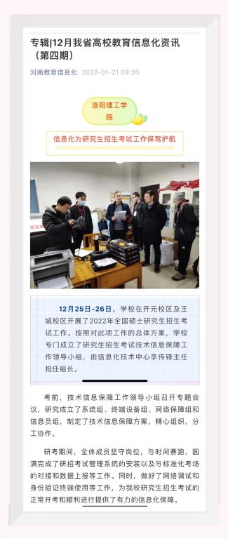 ? ?近日,河南教育信息化公众号在“专辑-12月我省高校教育信息化资讯(第四期)”的首位报道了“洛阳理...