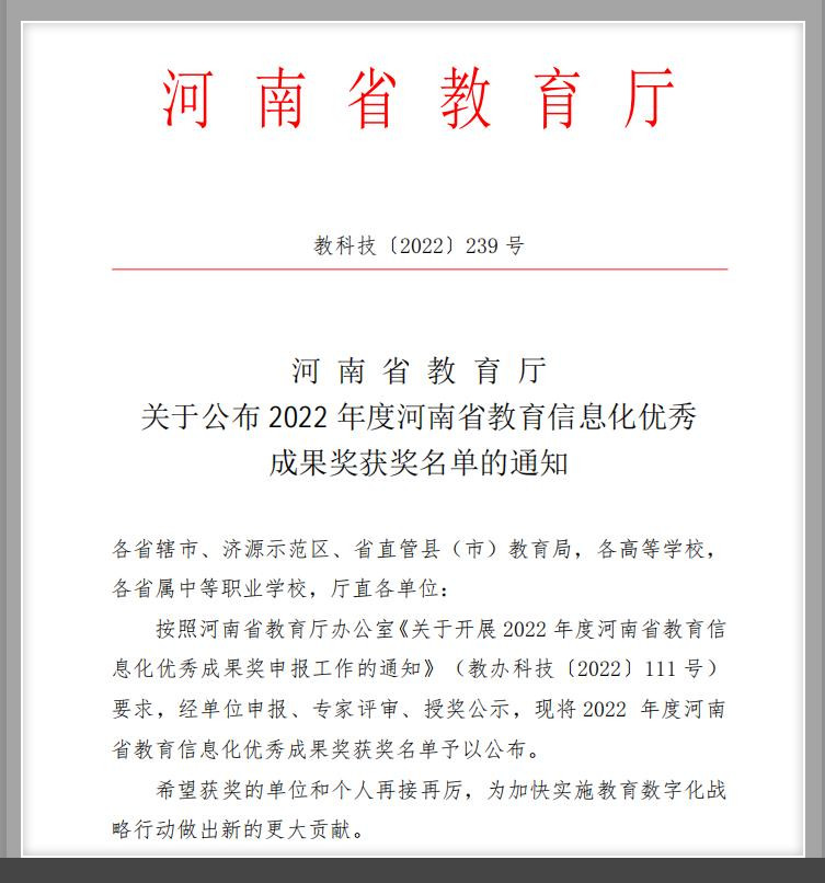 ?近日,河南省教育厅下发了《关于公布2022年度河南省教育信息化优秀成果奖获奖名单的通知》(教科技〔2...