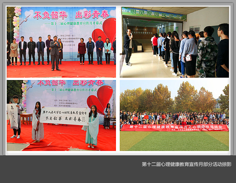 第十二届心理健康教育宣传月历时一个月,先后举行了启动仪式,新生心理普测,正能量?21天习惯养成,心理情景剧比赛,“心灵之约”专家讲座,“心灵天使”系列培训,又是一年开学季,心灵家园欢迎你——2018级新生参观大学生心理健康教育中心;“奔跑吧,青春!”——心理趣味运动会;走进“心”世界——现场咨询和测量活动;“心影随行”——影片赏析与交流等活动。通过开展丰富多彩的心理健康教育活动,更好地营造我校心理健康教育的良好氛围,帮助大学生树立正确的心理健康观念,培养大学生良好的心理品质和社会适应能力,促进大学生全面成长成才。