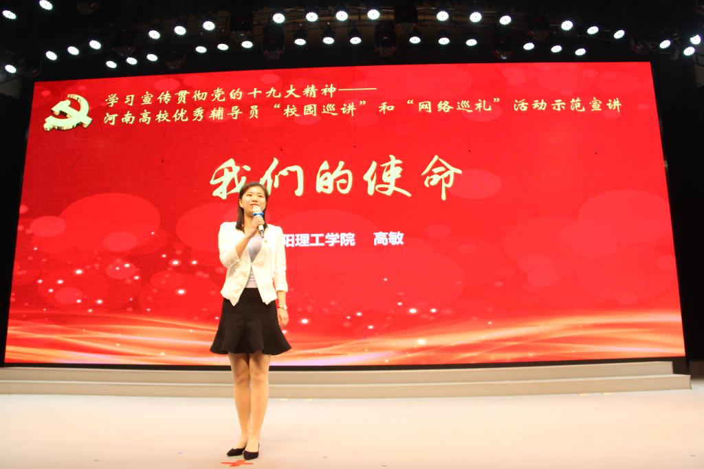 这次大赛共有来自全省的120余所高校选手参加,我校11名辅导员代表和全省高校900余名辅导员一道到场观摩。本次比赛综合考察了辅导员的语言表达、逻辑思维、心理辅导、思想教育、理论宣讲等多方面的知识和能力,全方位地展现了辅导员的个人素养、知识储备和专业技能。共评选出特等奖10名、一等奖22名。在随后召开的2018年度河南省高校辅导员工作交流暨现场会上,第六届全国高校辅导员职业能力大赛第五赛区复赛三等奖获得者,我校机械工程学院辅导员高敏老师,还在会上作了题为《我们的使命》的学习贯彻党的十九大精神示范宣讲。
