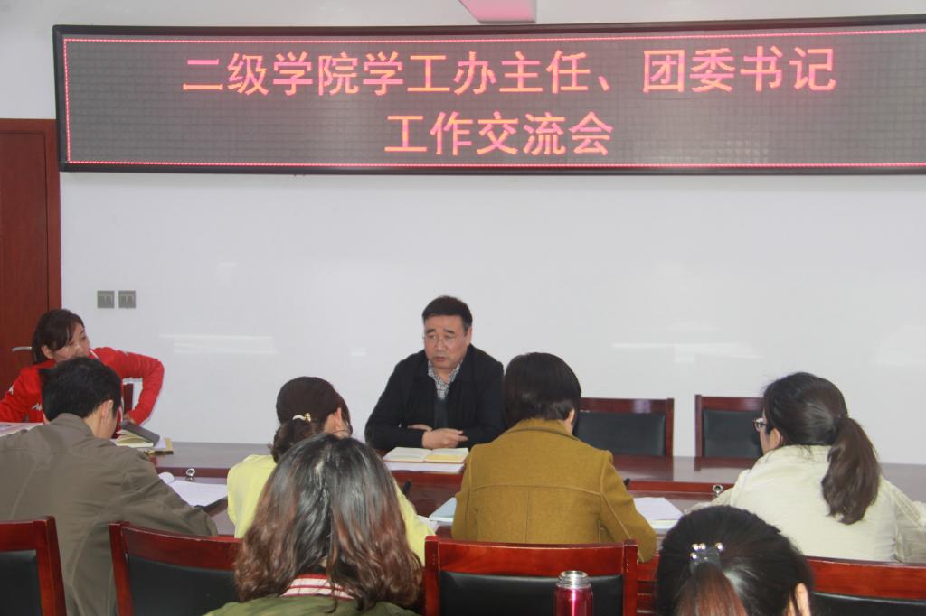 4月8日下午,学生工作处在大学生服务中心106会议室召开了二级学院学工办主任、团总支书记工作交流会,学生工作部、各学院学工办主任、团委书记参加了会议,会议由学生处处长张宽亮主持。