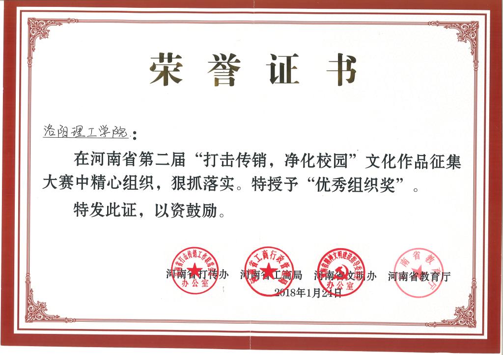 近日,河南省打击传销工作联席会议办公室、河南省工商局、河南省文明办、省教育厅联合发文,公布了全省高校第二届“打击传销 净化校园”文化作品征集评选结果,我校被授予“优秀组织奖”。张沛柯和余家远分别荣获文学类作品二、三等奖,宋伟荣获文学类创新奖;李晓光、任志轩、金宇和秦缘、石耘辉两组获得视频类作品优秀奖;罗瑞锋荣获优秀指导老师。