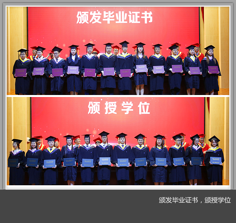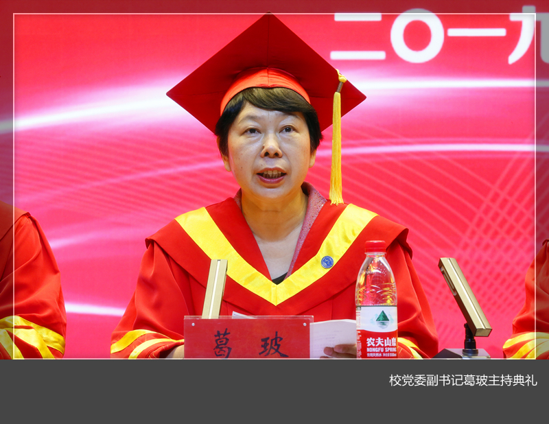 学校领导分别向省级、校级优秀毕业生代表颁发荣誉证书,向毕业生代表颁发毕业证书,为本科毕业生代表颁发学位证书并为他们扶正流苏。