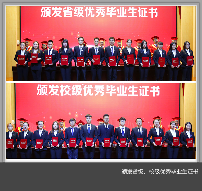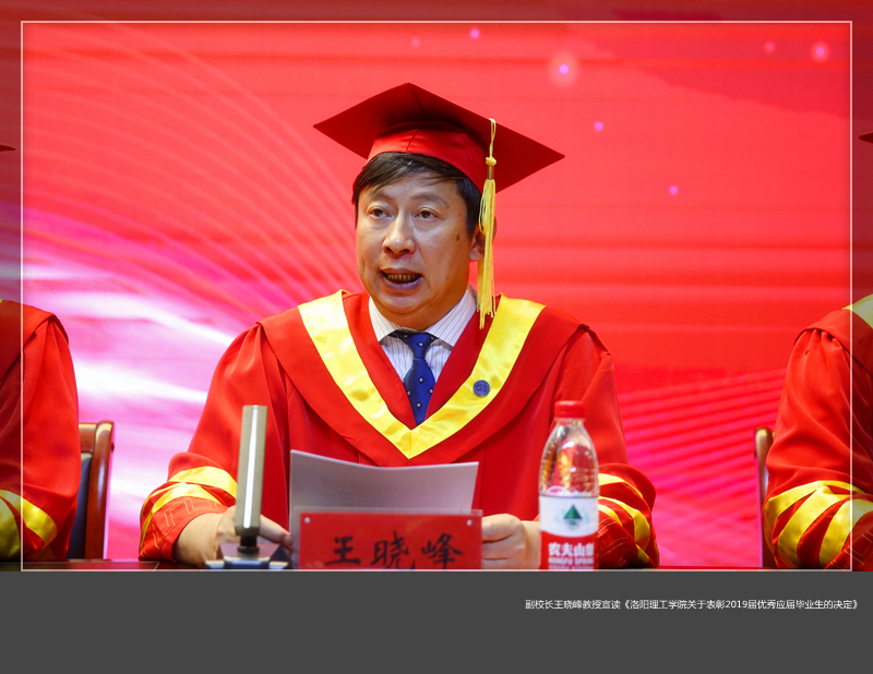 副校长王晓峰教授宣读了《洛阳腾博官网诚信为本专业服务关于表彰2019届优秀应届毕业生的决定》,授予王佳楠等781名毕业生为“2019年洛阳腾博官网诚信为本专业服务优秀应届毕业生”,对我校168名荣获“2019年河南省优秀应届毕业生”的同学一同表彰。
