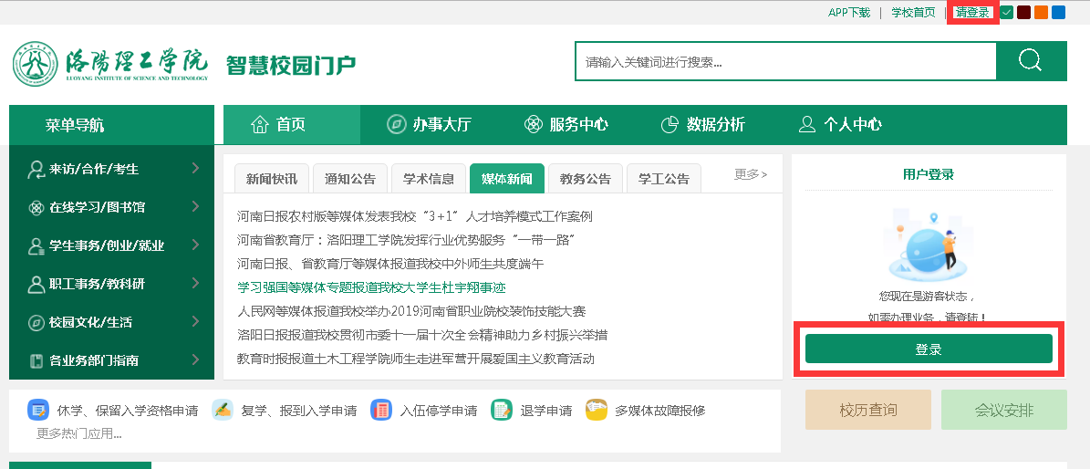 登录大学工系统有两种方式:一是直接输入大学工系统的地址:http://i.lit.edu.cn,点击登录按钮进入统一身份认证页面(登录页面)进行登录。二是通过登录学校主页右上角的“新版信息门户系统”-->服务中心-->大学工系统”进入。下面分别详细介绍这两种方式。