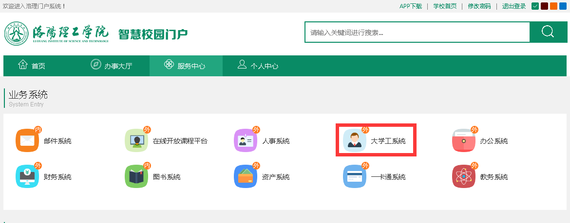 5、在业务系统中找到大学工系统点击就可以直接进入