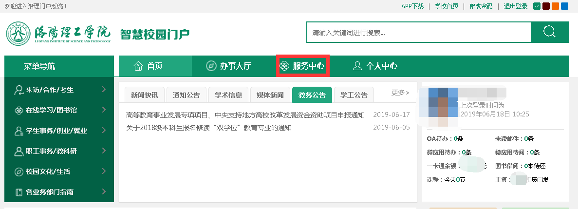 4.输入账号密码点击登录按钮进入信息门户(请仔细阅读登录按钮下面的说明),然后点击服务中心选项卡